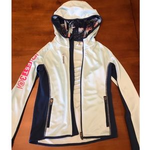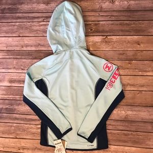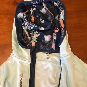 New With Tags two tone Reebok Playdry kids jacket with hood. Size Medium, inside of hood is Printed. Also has Inside pockets and thumb holes, as well as zip pockets at side.