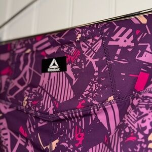Elevate your workout wardrobe with Reebok's vibrant purple leggings, designed for both style and performance. These capri-length leggings feature a striking geometric pattern, crafted from a stretchy, athletic fabric that ensures comfort and flexibility. Perfect for exercise, they offer a sleek, fitted silhouette that extends to mid-calf.