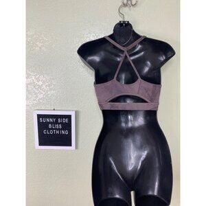This is a purple/gray scoop neck racerback sports bra. It is stretchy and is a size small but can fit a medium. In great preowned condition. No stains or flaws.