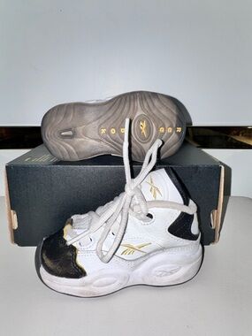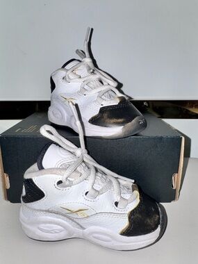 Classic high-top sneaker for kids. White leather upper with black toe and trim. Gold logo accent on the side. Lace-up closure for a snug fit. Sporty cushioned sole for daily play.