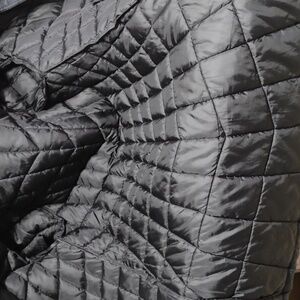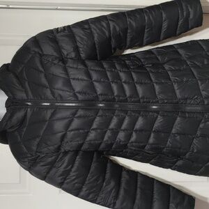 This is a fabulous black puffer jacket by Reebok. Hooded ultra lightweight warm thermolite puffer jacket. Shell 100% nylon filling is polyester. This puffer jacket is highly compressible double thermal insulation features unique thermolite infrared technology that is solar activated by sun or artificial light to keep you warm without being bulky. Also keeps warm when wet. keeps warmer than down in cold and wet weather. Ultra lightweight and breathable. Attached hoodie with elastic gives protection around face. Double zipper pockets as well, extremely comfortable. In excellent condition no call outs.size medium. measurements are approximately lying flat pit to pit 22". length 35'.