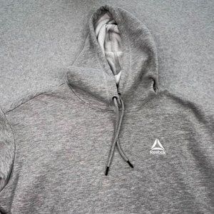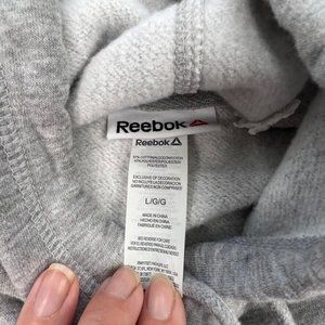 Elevate your casual wardrobe with this Reebok RBX Renew Women's Cropped Hoodie Sweatshirt in size large. The pullover style features a solid gray color with a classic sports theme and Reebok logo accents. The hoodie is designed with long sleeves and a relaxed fit, perfect for travel, activewear, and casual occasions.