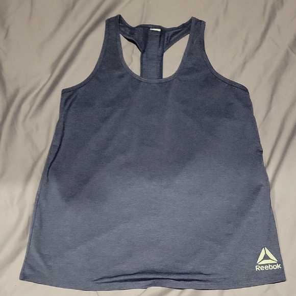 Heathered dusty blue reebok athletic top. Tag had been removed but it's a womens M. logo on front and down back.