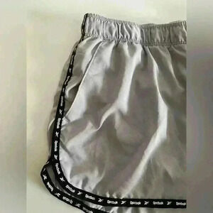 Reebok athletic short. Elastic waistband with drawstring. Side hip pockets. Built in interior lining/panty. Color: Grey with black edges. Size: small. Fiber tag missing. Measurements laying flat: waist 13.25”. Inseam 2.75”. Pet free smoke free environment.