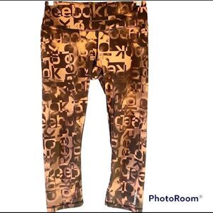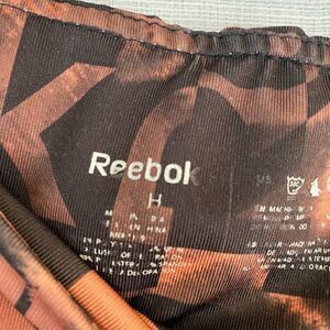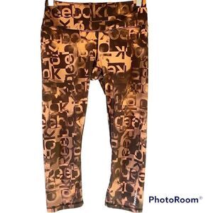 Reebok cropped workout pants with orange/black graffiti style Reebok pattern. No signs of wear or pilling on the outside of the pants.