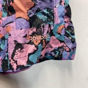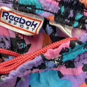 Elevate your athletic wardrobe with these vintage Reebok sport shorts in a bold and vibrant geometric print. Perfect for any active occasion, these shorts feature an adjustable waist size and relaxed fit for ultimate comfort. The breathable 100% nylon mesh fabric and drawstring feature make them ideal for gym & training, walking, cross training, CrossFit, bodybuilding, and running & jogging.