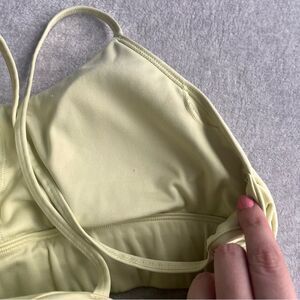 Cute electric yellow green Reebok sports bra with removable cup pads and cute strappy back. Some minor fading to the color and pilling. Comfortable! Lower support, best for low impact workouts like lifting. Inner tag cut out.