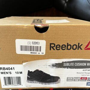 These Reebok Sublite Cushion Work shoes (model RB4041) are designed for ultimate comfort and protection on the job. They feature an alloy safety toe, MemoryTech massage footbed, and SubLite foam midsole for lightweight cushioning and all-day support. They are brand new with tags and box, in excellent condition, no wear, no tears, no stains, and color may vary based on lighting.