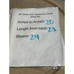 Flat measurements: Armpit to armpit - 20". Length from back - 23". Sleeve - 24".