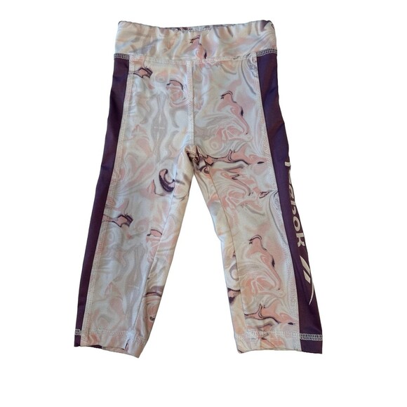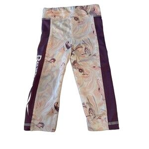 Adorable Reebok leggings for toddler girls, size 2T. Features a pink and purple marble swirl print with the Reebok logo on the side. Super stretchy and comfortable for playtime or casual wear. Condition: Excellent pre-owned condition with no visible flaws. Smoke-free home.