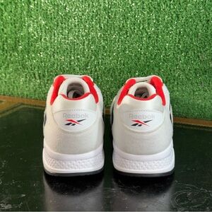 Experience timeless style with Reebok's white and red sneakers, featuring a retro silhouette and a minimalist design. Crafted with a leather-like upper and a durable rubber outsole, these low-top sneakers offer both comfort and a sporty aesthetic. Perfect for casual outings or athletic activities, they embody a clean and classic look.