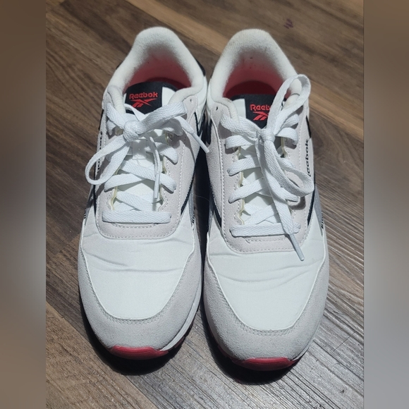 Classic Reebok sneakers in white and black. Red accents add a pop of color. Perfect for casual wear.