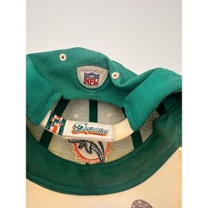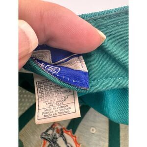 This Miami Dolphins baseball cap features the team's iconic teal dolphin logo on a green crown with a contrasting off-white brim. Red and green striping on the brim adds a touch of classic sports style. The breathable mesh back ensures comfort, making this cap perfect for showing team spirit on game day or any casual occasion.