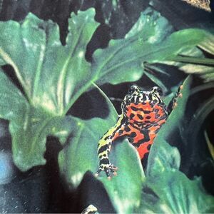 The print has Venus fly traps, palms, hibiscus flowers, tropical foliage with snakes, frogs, black panthers, and jelly fish all over.