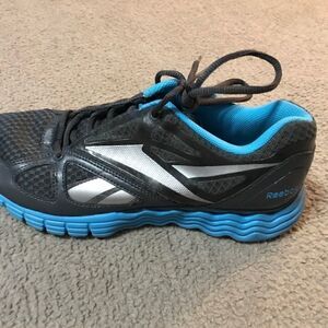 Reebok Vibetech women’s US size 8 running shoes in black, blue, and silver.