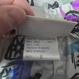 Details: mini, pleated front, zip and button back closure, some stretch, all over print, front pockets