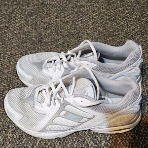 Experience ultimate comfort and support with Reebok's white athletic shoes, featuring a breathable mesh upper and a cushioned midsole for enhanced performance. The sleek design includes subtle light blue accents, adding a touch of style to your workout gear.