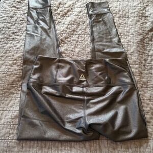 Keywords: Reebok leggings, womens athletic leggings, black leggings, shiny leggings, workout pants, yoga pants, running tights, activewear, size large, athletic apparel, gym leggings, side pocket leggings, performance leggings