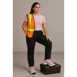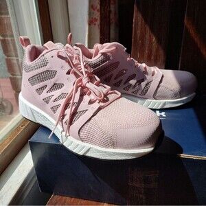 Step up your style with these Reebok women's athletic/work shoes in a chic pink shade. Perfect for workouts or casual outings, these shoes offer comfort and support. See last photo which details the safety guidelines that these shoes conform to.