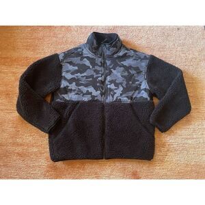 This Reebok Women's Super Soft Gravity Sherpa Jacket in size M features a black camouflage pattern with a grey faux fur lining. The jacket has long sleeves and a zip closure. It includes pockets for convenience and is made of polyester. The jacket offers a regular fit and a full-zip design, making it a stylish and functional addition to any wardrobe.