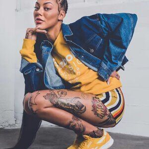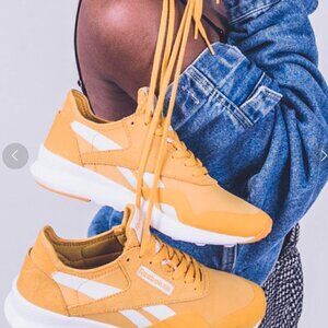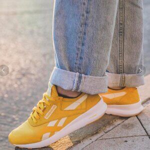 Bright yellow sneakers with iconic Reebok style. Perfect for casual wear.