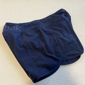 This product is a pair of Reebok Women's SMALL blue heathered Workout Shorts in size S, aimed at women who engage in running and jogging or sports activities as wrll as comfortable athleisure wear. The shorts feature a