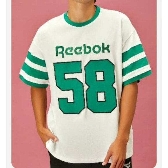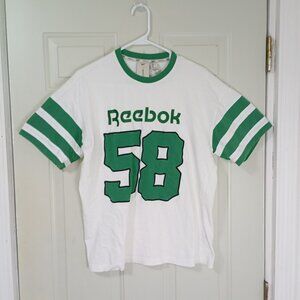 Used in good condition. Measurements and details in the photos. A collaborative Reebok and Forever 21 men's sports tee featuring bold green accents and a standout "58" graphic. Crafted from breathable cotton for all-day comfort. • Crewneck design • Short sleeves with striped green detailing • Lightweight and breathable • Bold green "58" print with Reebok logo • Size M.