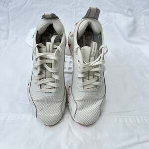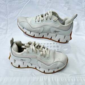 Reebok Zig Dynamica Women's Training Running Shoes in white, size 8.5. These sneakers feature a minimalist design with a responsive ZigTech midsole for cushioned comfort and energy return, perfect for training or everyday wear. The durable rubber outsole provides reliable traction. Excellent used condition with minor signs of wear visible on the soles and upper, as shown in the photos.