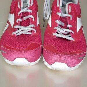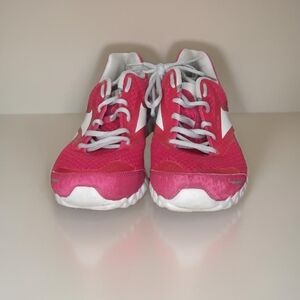 Stylish pink and white athletic shoes by Reebok. Perfect for sports and casual wear.