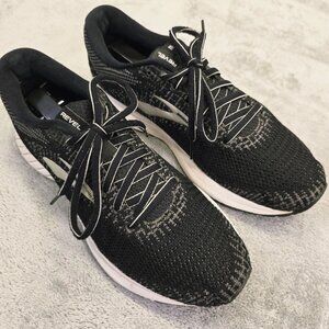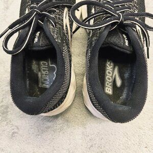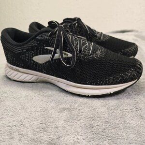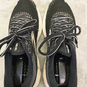 Pre-owned pair of womens Brooks Revel 3 shoes. These are black and size 8B. The front of the soles are worn down a little bit. I would call these a solid pair of work shoes or everyday shoes.