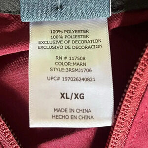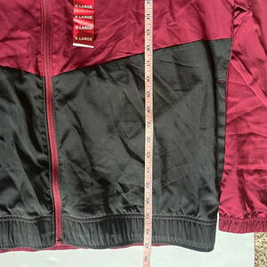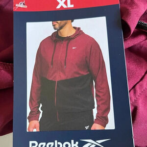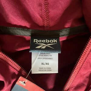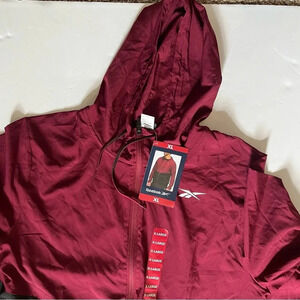 Brand new with tags, never worn, Reebok, Size XL, color block design, lightweight, zip up, training woven jacket, Maroon and Black, drawcord adjustable hood, on seam pockets, regular fit, 100% polyester, please see pictures for approximate measurements, lightweight