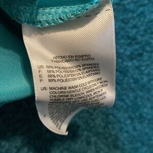Reebok Zip up lightweight jacket. The color is more like in the second picture, a light teal type color. There is a small black mark at bottom of right sleeve, but is not noticeable when on. Front pockets. Size small