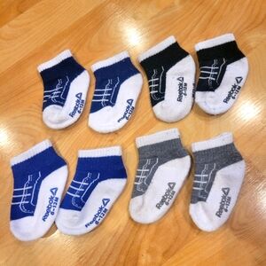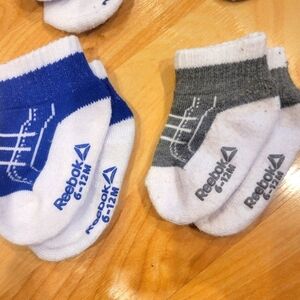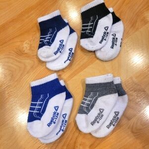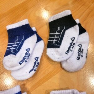 4 pairs of thick and cozy warm baby socks that have a tennis shoe design by reebok. Marked 6-12 months. In my opinion, they run on the small side. probably best 3-9 months but that's just my opinion. A few fuzzies here and there otherwise great. Black pair has the most fuzzies. Royal blue pair never worn.