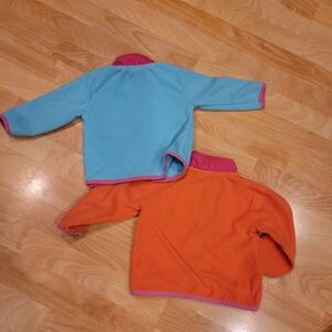 2 great layering options. Signs of washing and wear. Fading to logo. Still super practical and functional for easy layering. One is 12 months size. the other is 18 months so will give you some options.