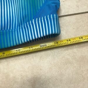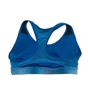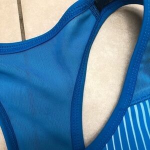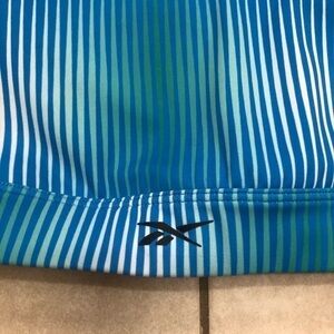 Reebok hero racer sports bra, small, green blue and white stripes, thick breast band, Reebok emblem on front, mesh panels, removable pads, cut out opening in back, sweat wicking fabric. Slight white mark on inside bra.