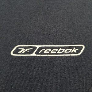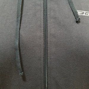 Solid zip up hoodie. Drawstring hood. Tuxedo stripe on the sides. Pockets. Reebok logo on the front right bust. Early 2000's at the latest. Active, activewear, athletic, athleisure, gym, workout, lounge, loungewear, casual, stretch.