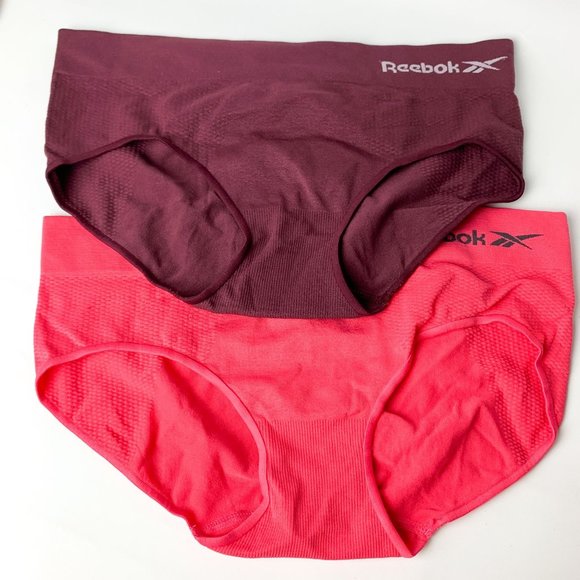 Reebok low rise athletic full coverage brief set/ pair of 2 underwear in size medium. Pink and burgundy red color. New, never worn. Faint dirt mark on exterior