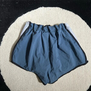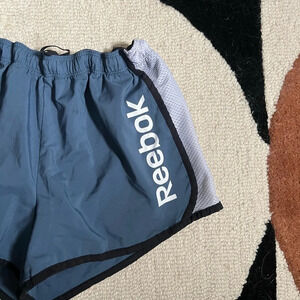 Slate blue and white Reebok running shirt with drawstring elastic waistband.