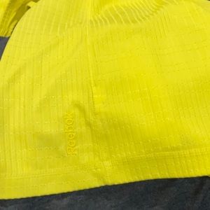 Reebok PlayDry bright yellow workout shirt. Longer length. 91% polyester, 9% spandex. Size L but runs small. Great condition.