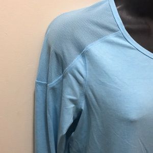 In light blue,Soft technical fabric fitness wear beautiful color mesh panel on shoulders for vent and style