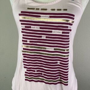Reebok racerback tank top “Leave ‘em Speechless” text down the front in gold and burgundy. Reebok text in gold and silver logo down left shoulder. Gently used condition - text and logos are crisp and not cracked. Asymmetrical raw hem.