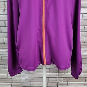 Stand up collar meets full zipper front in a two-tone purple and coral polyester dri fit jacket. Great pre-owned condition.
