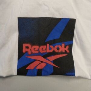 White tank top featuring the Reebok logo in red and blue. Perfect for casual wear.
