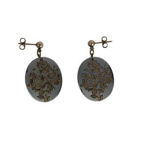 Reed & Barton Damascene hanging oval earrings. Pierced post earrings. Cottagecore rose pattern w/ distressing. The wear/distressed look is not original to the piece, but I did purchase them in this condition because I like the shabby/aged look that it gives them.