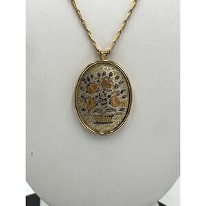 Reed & Barton Damascene Orange flowers Oval Pendant Gold Tone Necklace