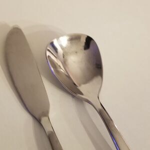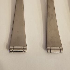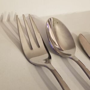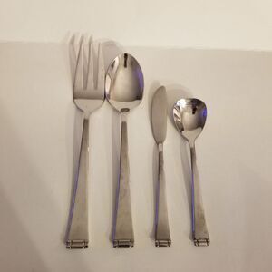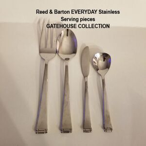 Reed & Barton Everyday Gatehouse pattern 4 piece lot. 1 serving spoon, 1 cold meat serving fork, 1 master butter knife a nd 1 sugar spoon. Glossy square bottom. All in good condition.