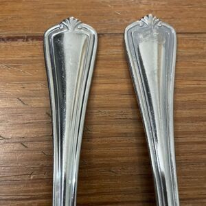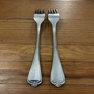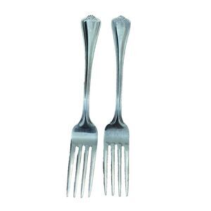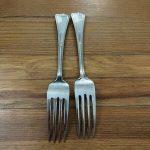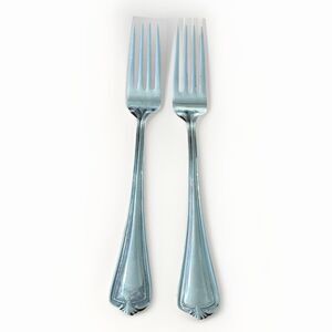 Lot of two stainless steel, dinner forks in the Hadley pattern by Reed and Barton. The pattern has been discontinued. Dishwasher safe. In great pre-owned condition with minor signs of wear from normal use.