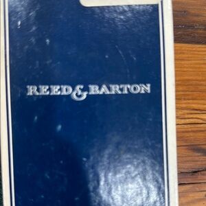 Elegant packaging by Reed & Barton. Silver bell with toddler holding a sock.