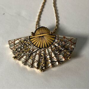 Reed & Barton Vintage Damascene Fan Pendant and Necklace. Great pre-owned condition. Gold tone chain with lobster claw clasp. Decorative etched fan pendant. Measures approximately pendant 1.5" x 1", chain 15".