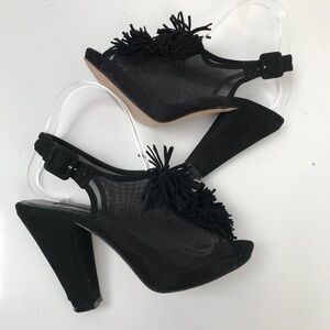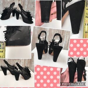Gorgeous black suede fringe and pompom slingback heels. Size 6